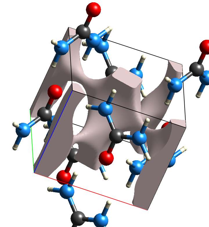 In CrystalExplorer the void surface is defined as an isosurface of the procrystal electron density, and calculated for a whole the unit cell. The default isovalue is 0.002 . Such a void surface for urea is pictured on the right.