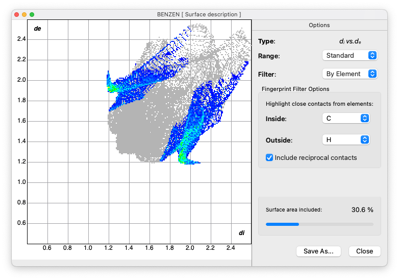 To see the C--H···π feature, filter the plot to show C inside and H outside, including reciprocal contacts