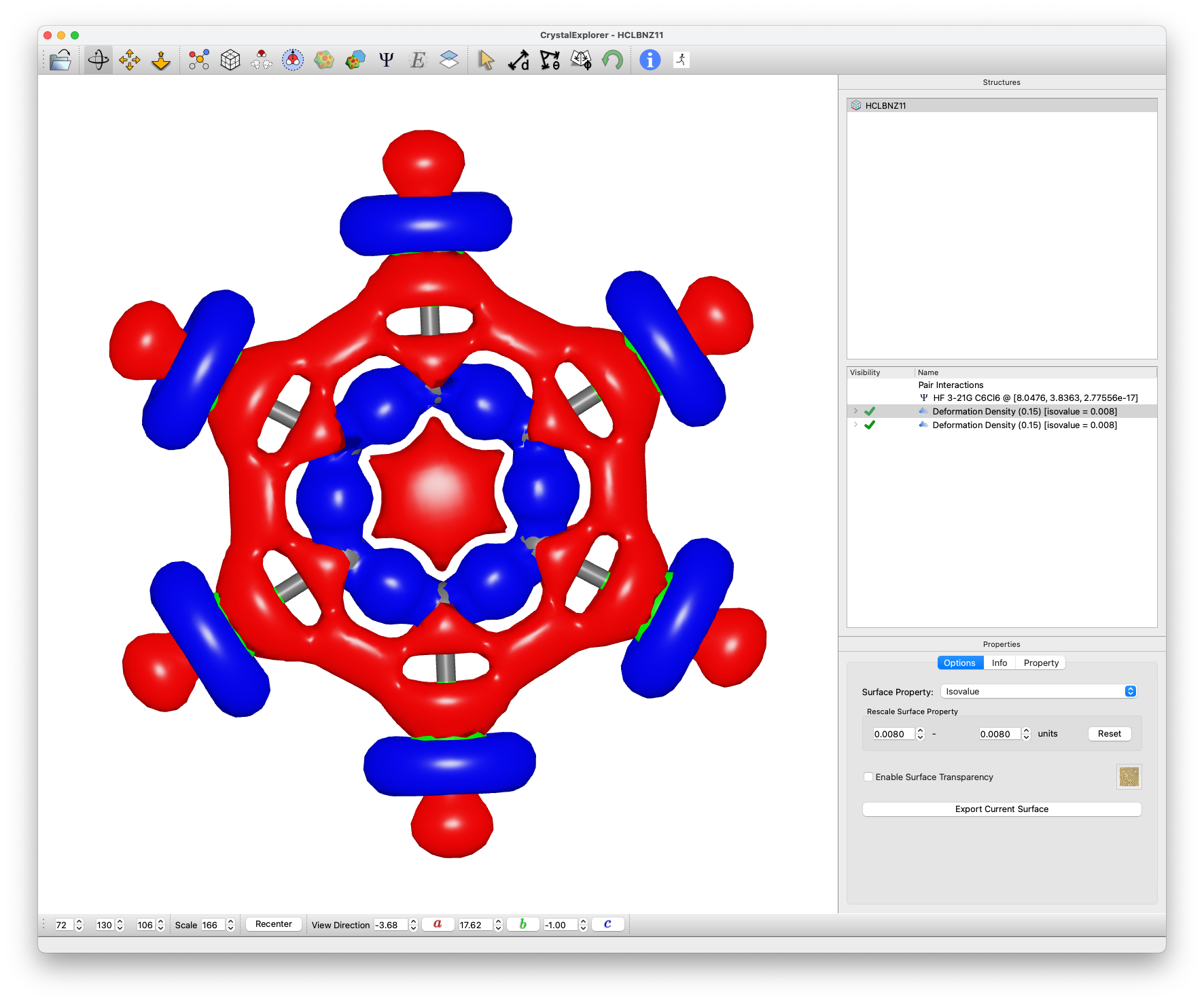 Observe how positive electrostatic potential regions at C--Cl bond extensions correspond to electron density deficit areas (red)
